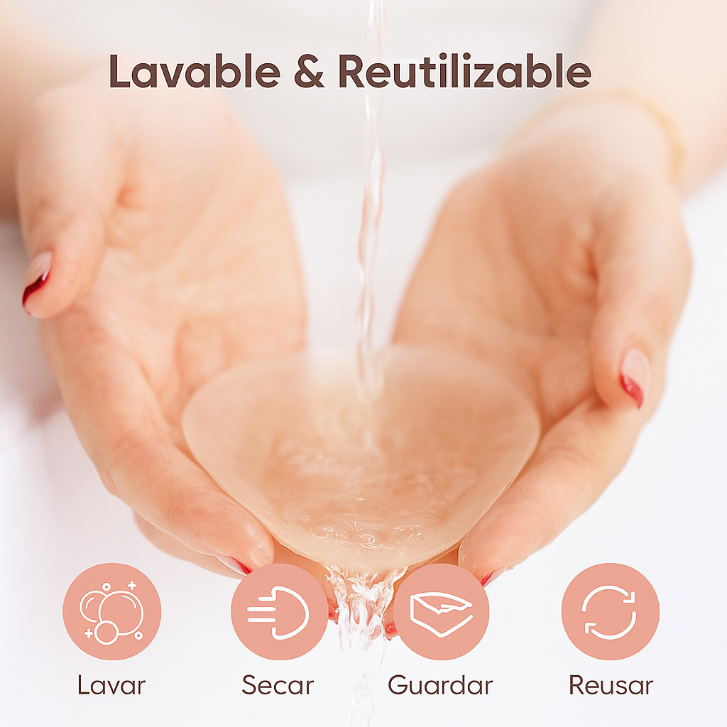 Adhesivo de silicona de grado hipoalergénico, se reactiva cuando se lava y es reutilizable hasta 30 usos.